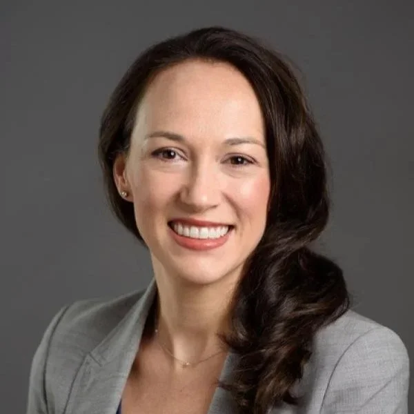 • Mulher sorridente com roupa formal cinza e cabelo castanho escuro liso sobre fundo cinza